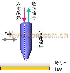 图2_2是近场光学显微镜的原理示意图。将一个同时具有传输激光和接收信号功能的光纤微探针移近样品表面,微探针表面除了尖端部分以外均镀有金属层以防止光信号泄露,探针的尖端未镀金属层的裸露部分用于在微区发射激光和接收信号。当控制光纤探针在样品表面扫描时,探针一方面发射激光在样品表面形成隐失场,另一方面又接收10-100纳米范围内的近场信号。探针接收到的近场信号经光纤传输到光学镜头或数字摄像头进行记录、处理,在逐点还原成图象等信号。近场光学显微镜的其它部分与STM或AFM很相似。